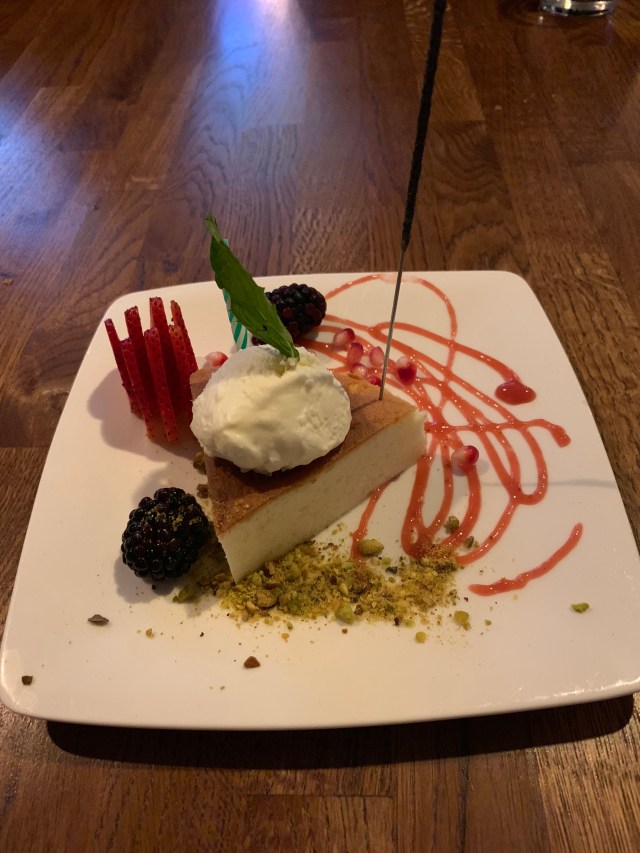 Japanese cheesecake with berries and pistachios.